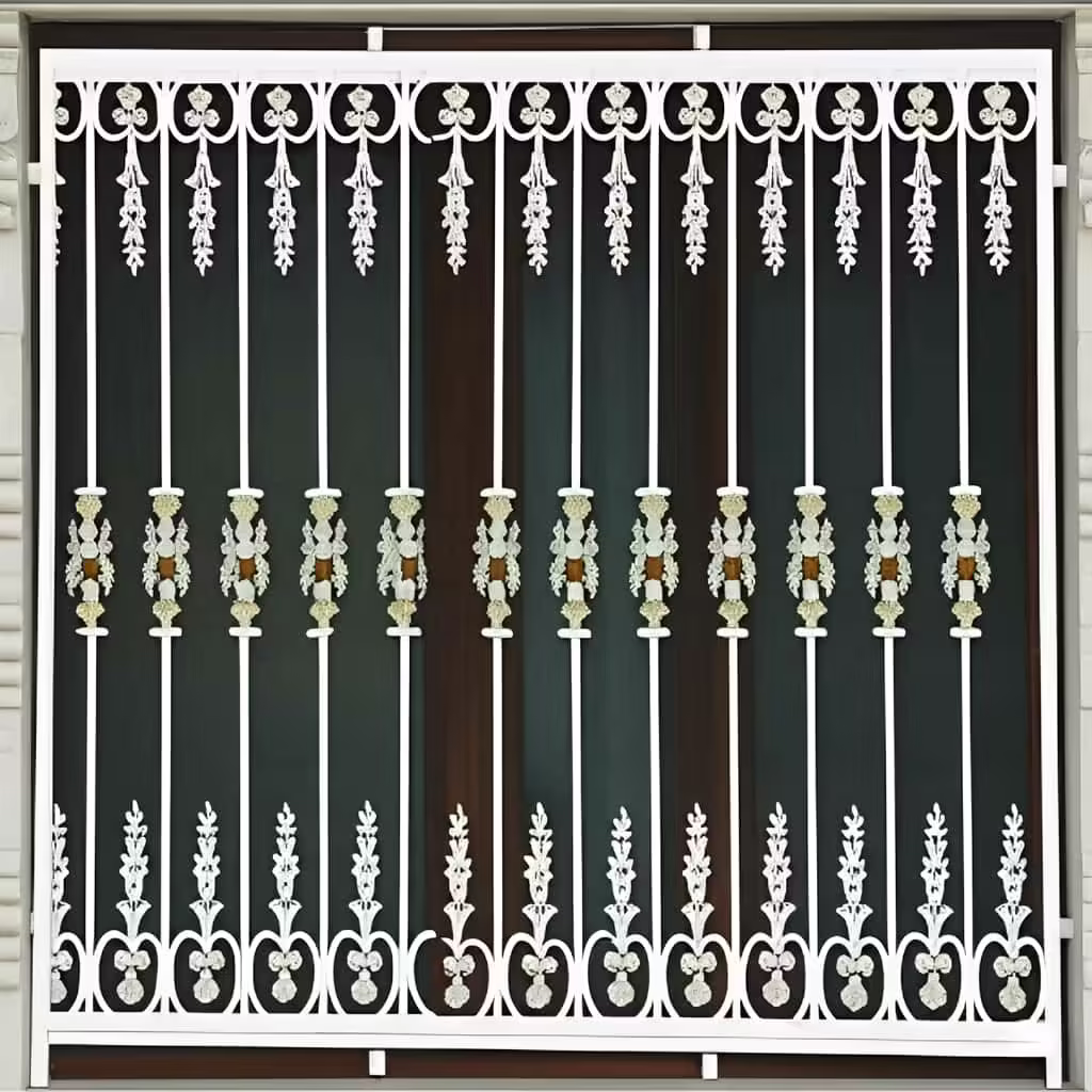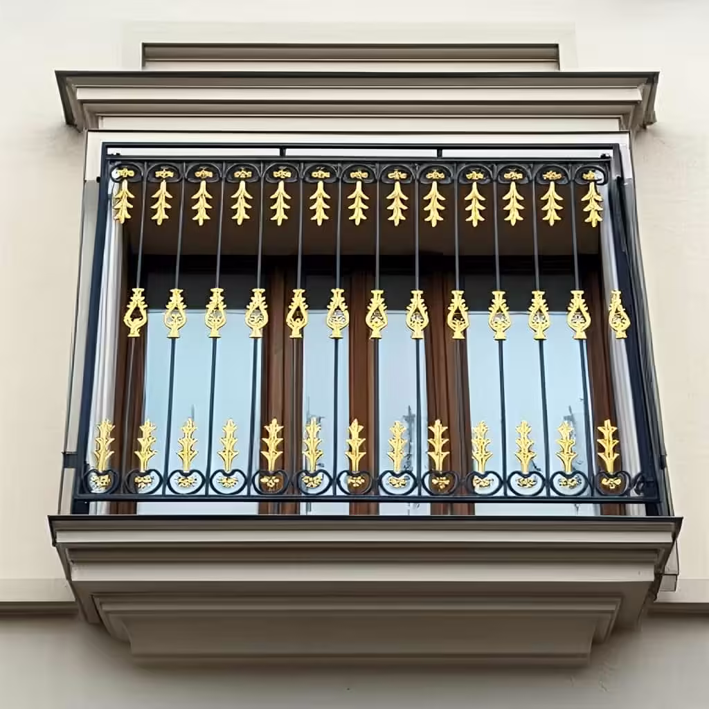 حفاظ پنجره مدل افشان در خرم آباد به عنوان یکی از گزینه‌های لوکس و زیبا برای ساختمان‌های کلاسیک و رومی شناخته می‌شود. این مدل با ترکیب تزئینات طلایی و فریم‌های سفید، جلوه‌ای سلطنتی و متفاوت به نمای ساختمان می‌بخشد. میله‌های عمودی آن از پروفیل آهنی مستحکم با ابعاد 20×20 میلی‌متر ساخته شده‌اند و فریم اصلی نیز از پروفیل 30×30 میلی‌متر تشکیل شده است. اتصال دقیق قطعات با جوش CO2 انجام می‌شود تا مقاومت بالایی ایجاد کند.